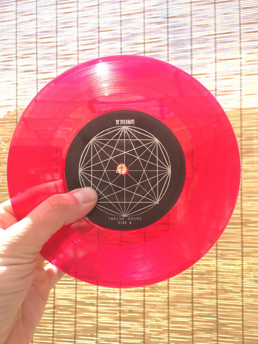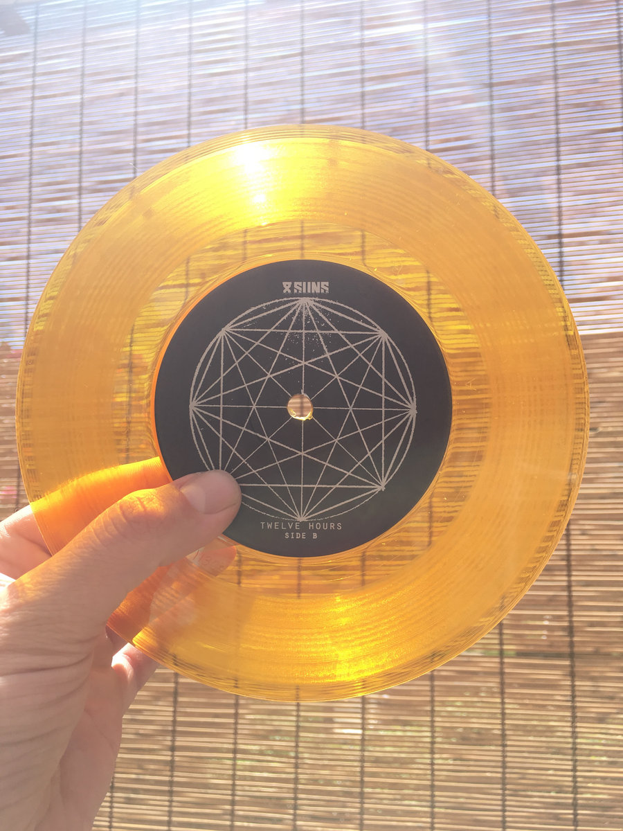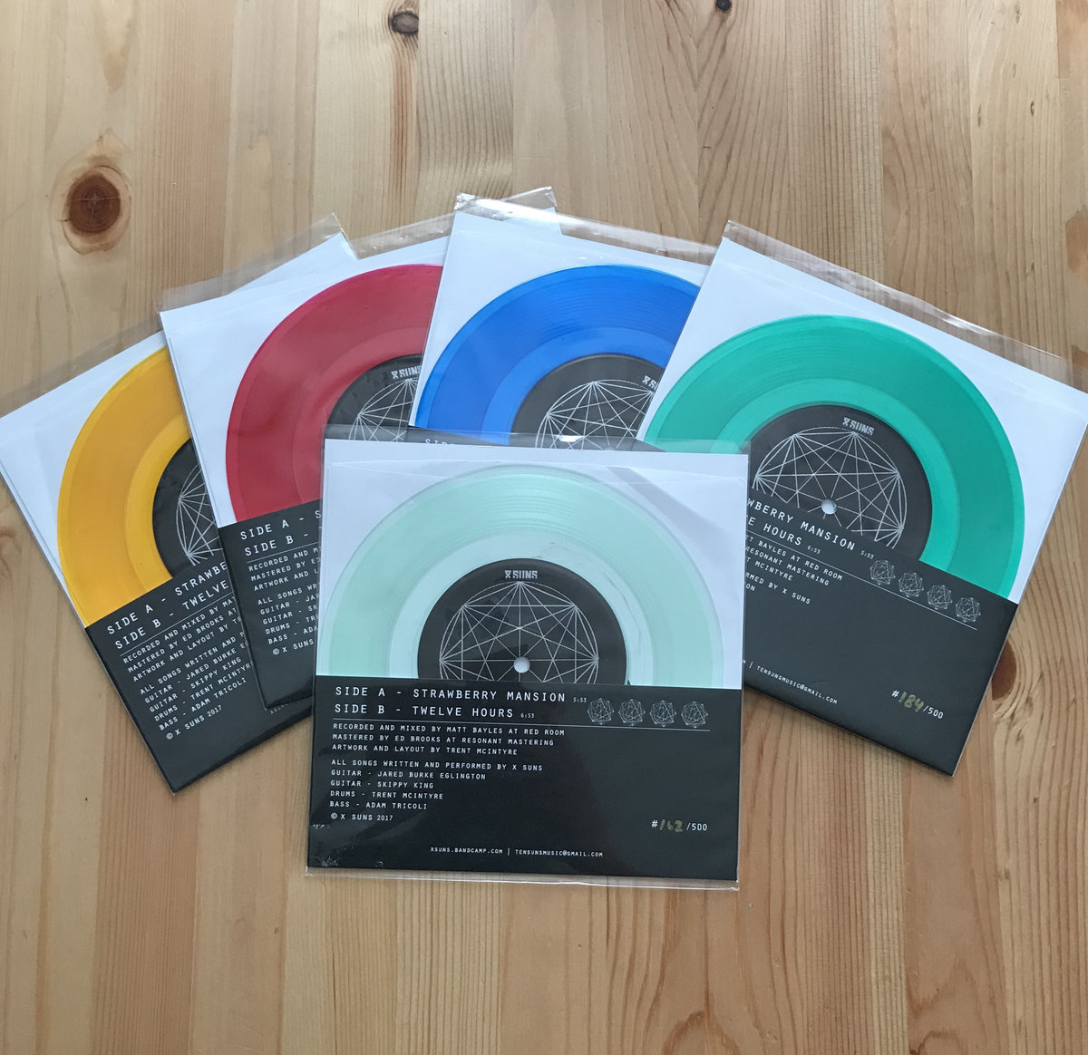 Strawberry Mansion/Twelve Hours - 7 Inch Vinyl. Limited to 500 copies, hand numbered, with 6 different color options: coke bottle clear, clear red, clear blue, clear green, clear gold ("Butterscotch"), or random mixed translucent color. Artwork and Layout by Trent McIntyre.